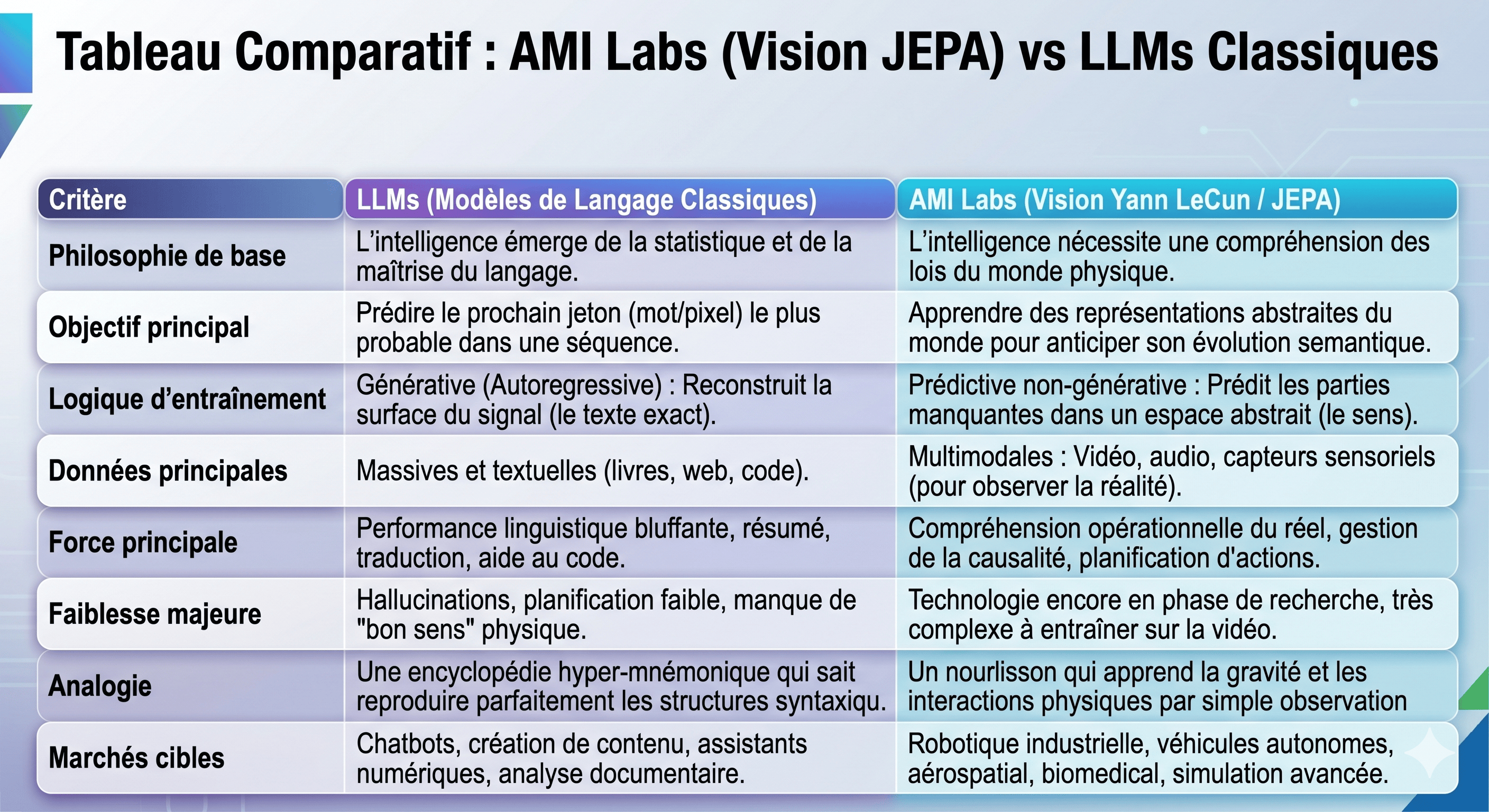 Selon lui, prédire le mot suivant ne suffit pas pour produire une intelligence capable de comprendre le monde. Un LLM peut générer un texte crédible, mais il reste limité dès qu’il faut raisonner sur la causalité, les contraintes physiques ou la dynamique d’un environnement.